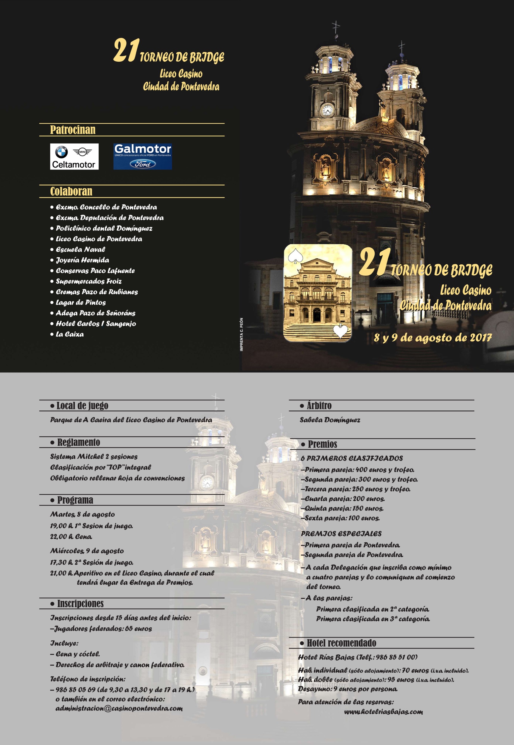 Los pasados días 8 y 9 de Agosto de 2017, se celebró en las instalaciones de La Caeira del Liceo Casino de Pontevedra el XXI Torneo de Bridge ‘Ciudad de Pontevedra’ organizado por el Club de Bridge de esa Sociedad. El torneo contó con la participación de 47 parejas.